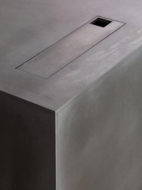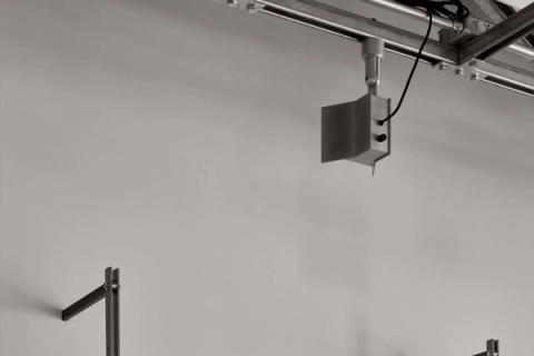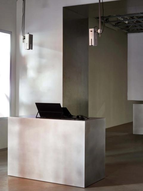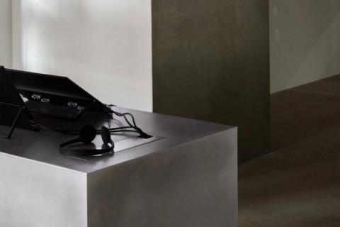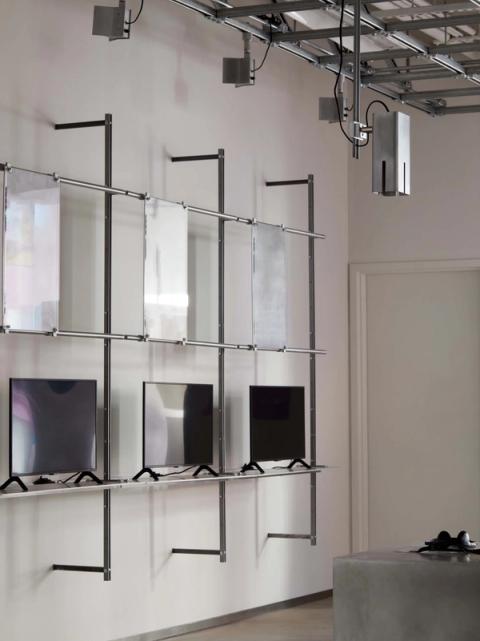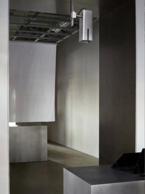The space is arranged in a series of distinct rooms, each offering a different mode of interacting with content from immersive projection to a speaker monolith. We developed a collection of custom aluminum lighting, rolling plinths, and over-scaled metal thresholds, creating an environment of raw industrial experimentation balanced with precision and restraint.