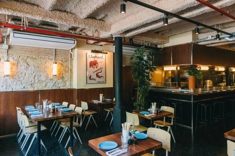 Located in historic Casa Bonay, Elephant Crocodile Monkey is a trip in itself. The menu is certainly a composite of traditions and cuisines but carefully layered in a uniquely Catalan manner. The space itself is playful and lush, with overgrown vines hanging over bins of natural wine. Wood veneered walls with aluminum detailing stem from train car references and romantic cues of travel and escape. A neon sign flashes outside the window reflecting the namesake, alternating between an elephant, crocodile and monkey. That's all one needs to know.
