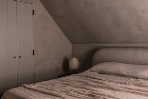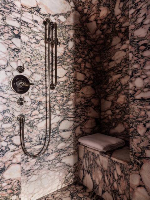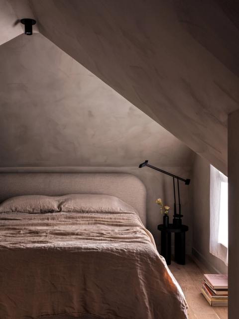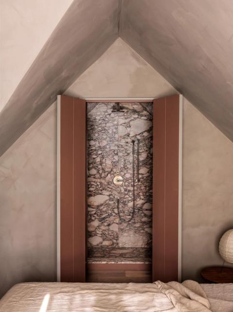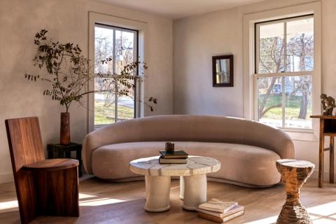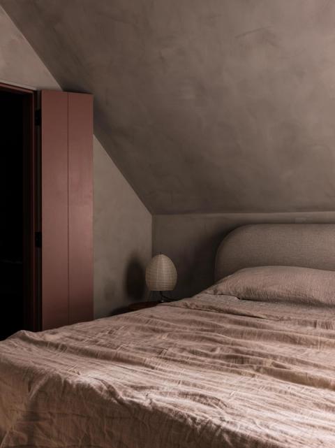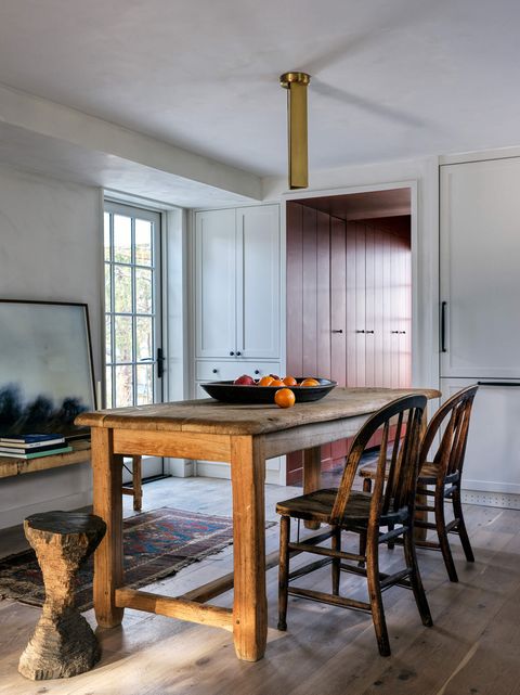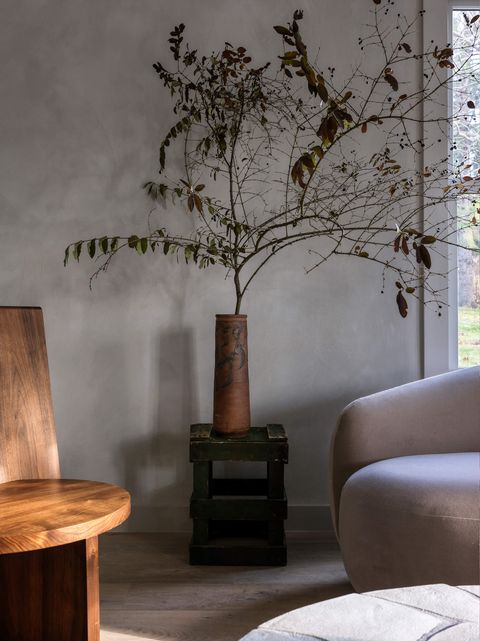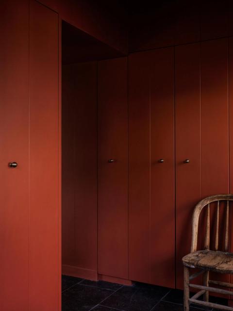 The philosophy was to create a rhythm of light and dark, restraint and saturation. Smaller, more intimate spaces are flooded with color and texture — a red mudroom, an earthy guest room, or a bath fully built out of Calacatta Rosa marble, while more open spaces are painted in subtly shifting tones of limewash. The furniture represents a collection of contemporary works, as well as vintage sourced throughout the Hudson valley.