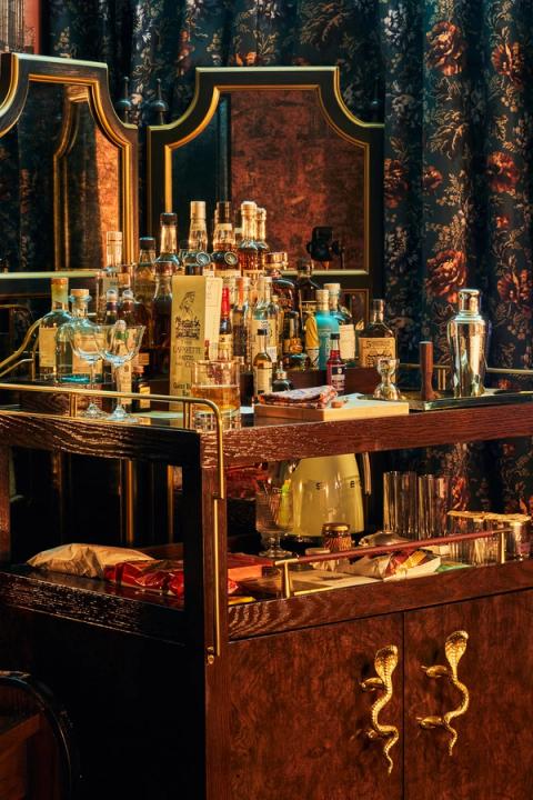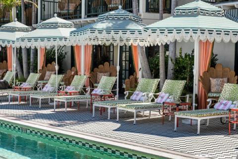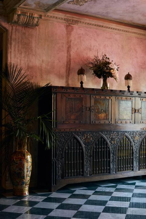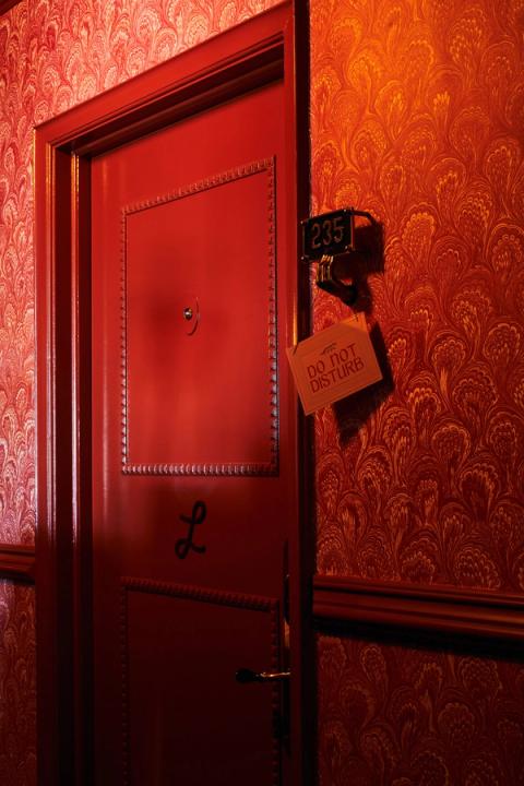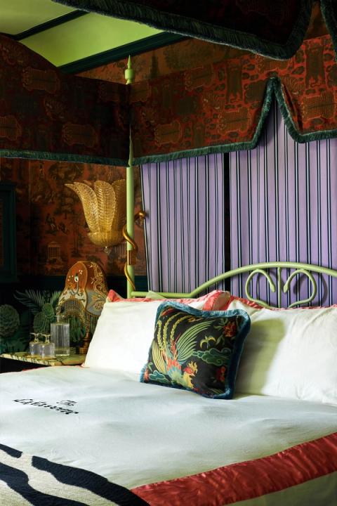 The LaFayette Hotel and Swim Club is home to a range of guest rooms, suites, and townhouses rooted in traditional Victorian, Tudor, and Gothic details. Rich saturations of color, texture, and pattern immerse guests in a fanciful experience that is much more than just a place of rest. Design elements such as wallpaper ceilings, saturated wall tones, fabric draped canopy beds, and burled bar carts read as functional sculpture or art.