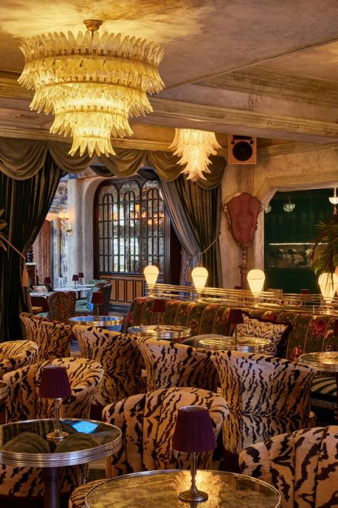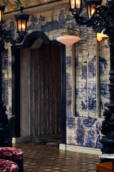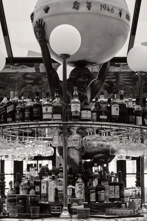 The Lobby Bar iscircular in design under the soaring glass atrium flooding the space with light and is anchored by the Atlas statue and surrounded by a hand-painted ceiling by Brazilian-based artist Joāo Incerti. The bar is constructed with detailed wood surrounded by delicate banquettes with wrought iron lamps and is a convenient meeting space and starting point to the many dining and entertainment rooms held within the hotel.