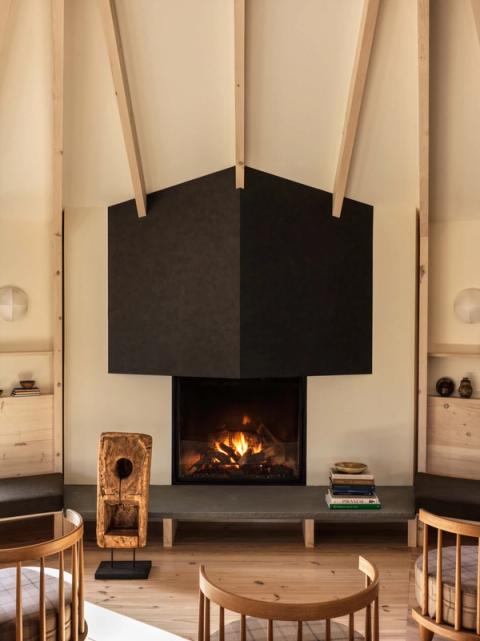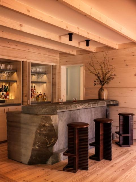 The main lodge features a bar for small parties and lounge spaces for larger gatherings. The design team tapped notable furniture designers from across the Hudson Valley and North East to build heirloom quality pieces, with the intention to highlight the incredible craft in the area.