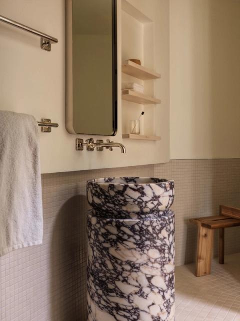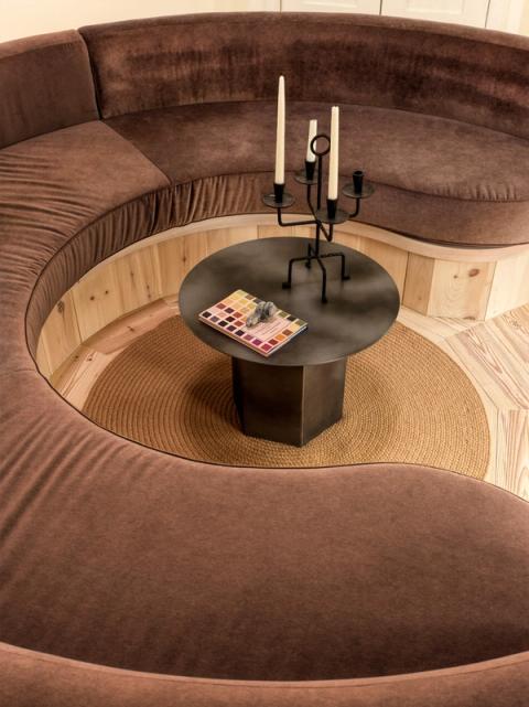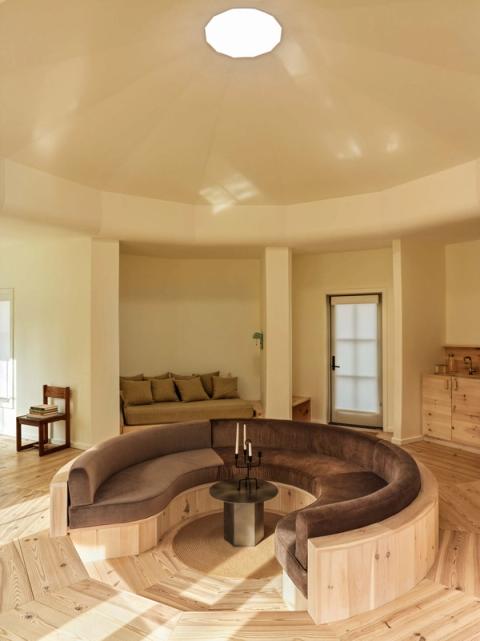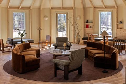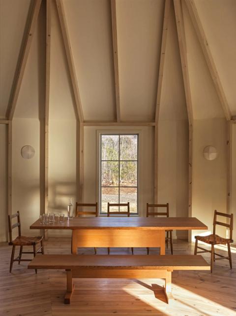 The guest buildings revolve around a centralized amenity lodge; an inviting locus for friends and new acquaintances alike to meet and reconvene throughout their stay. At the heart of each room, a central oculus allows one to experience the shifting light and shadows through the day. The team developed a circular strategy to the buildings as a device to frame specific vantage points while maintaining privacy. Each Round has 12 sides, where each facet holds a different program for daily routines, for example, a daybed, a wet bar, or stove. The structures are clad entirely in shingles, speaking to local historic vernaculars while the interiors adopt the use of knotty pine throughout the spaces. At the center of the suites, a sunken circular sofa references Scribner’s more recent mid-century history-this time dressed in a more subdued and minimalist fashion. The baths echo the same geometry where a round marble sink aligns with the axis of the room.